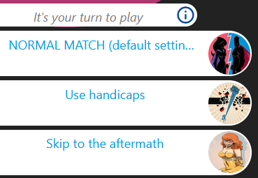Selecting this action will lead to a simple game options menu system of actions. Please note that in bot games, the bot will NOT select these options for you. The player will always decide on the setup of the game.