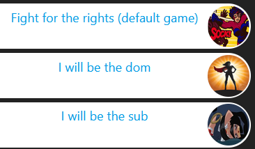 If you choose to skip to the aftermath, you can bypass the fight and go straight to the sexy scene. This is perfect for that jail or dungeon scene, or RPing an interrogation! Basically, the game then becomes a designated dom/sub RP mode with a superhero/villain context.